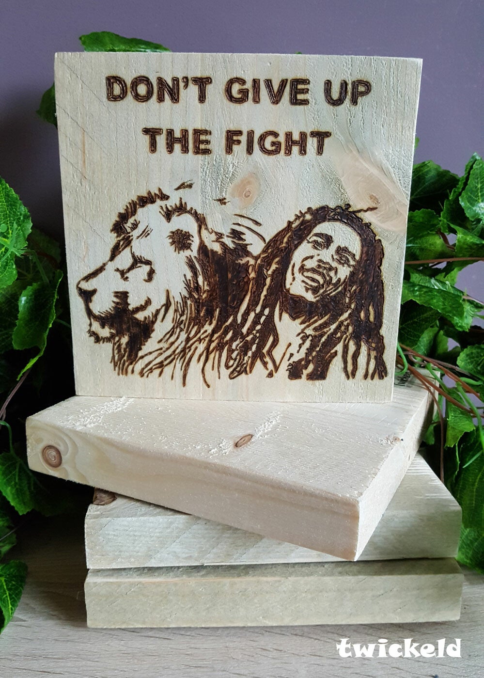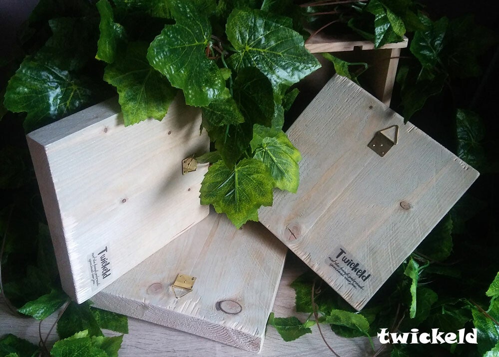 Dit houten blok kun je op een mooi plekje zetten of ophangen met het haakje dat aan de achterkant is bevestigd.
