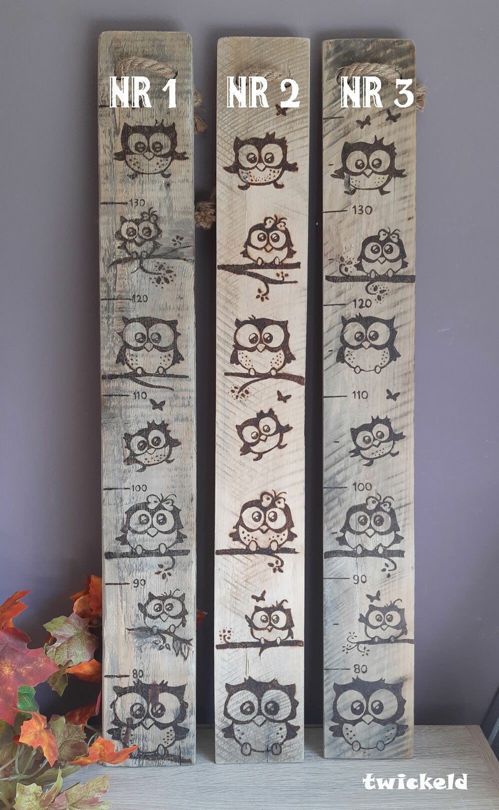 - Op nr 2 staan geen centimeters, dus daar kun je zelf naar wens lengtes op zetten. Of je gebruikt 'm niet als groeimeter, maar gewoon voor de sier.