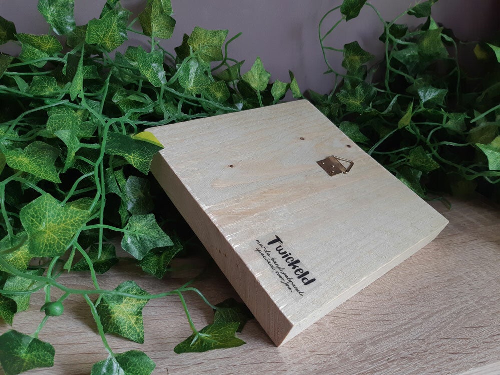 Dit houten blok kun je op een mooi plekje zetten of ophangen met het haakje dat aan de achterkant is bevestigd.