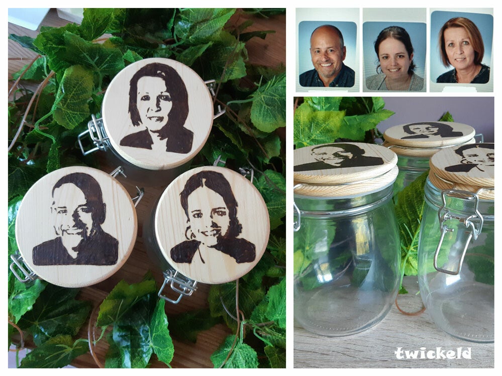 Je kunt aangeven wat je graag in de deksel gebrand wilt hebben. Op de foto's zie je wat voorbeelden van eerder gebrande weckpotten.